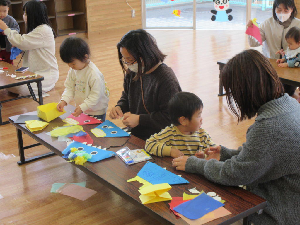 皆で歌を歌ってお祝いした後、牛乳パックで大きなコマを作って遊びました。