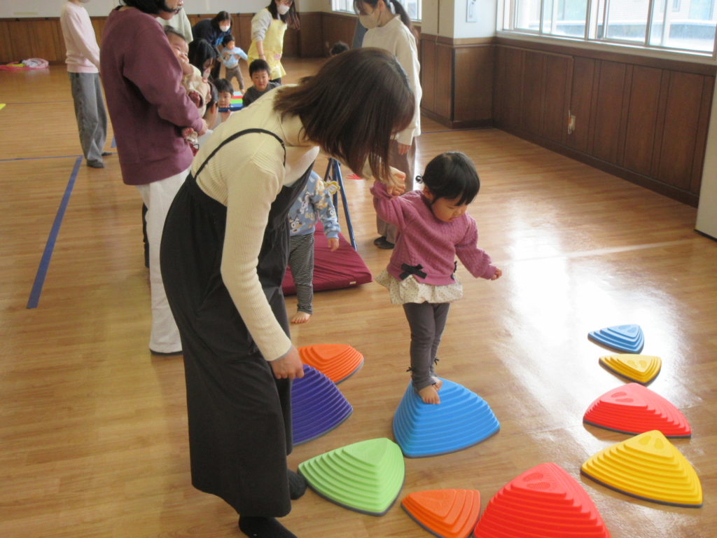 ボールの色分けはバッチリ! 三角のお山も上手に歩けました。
